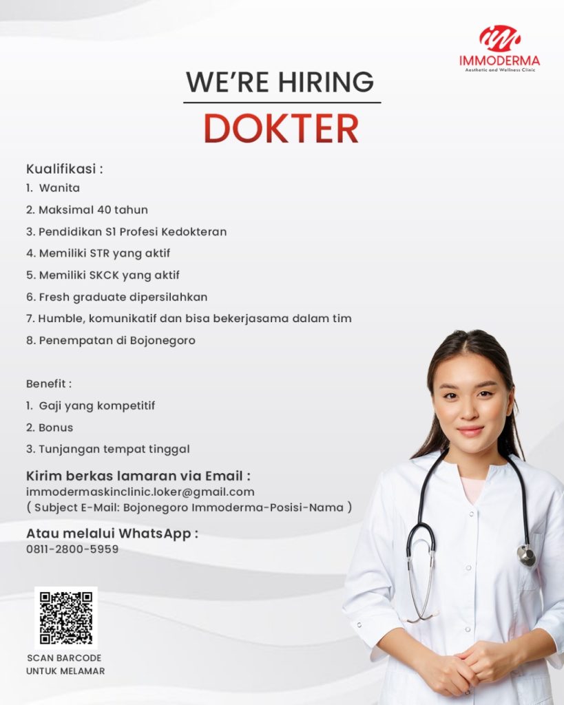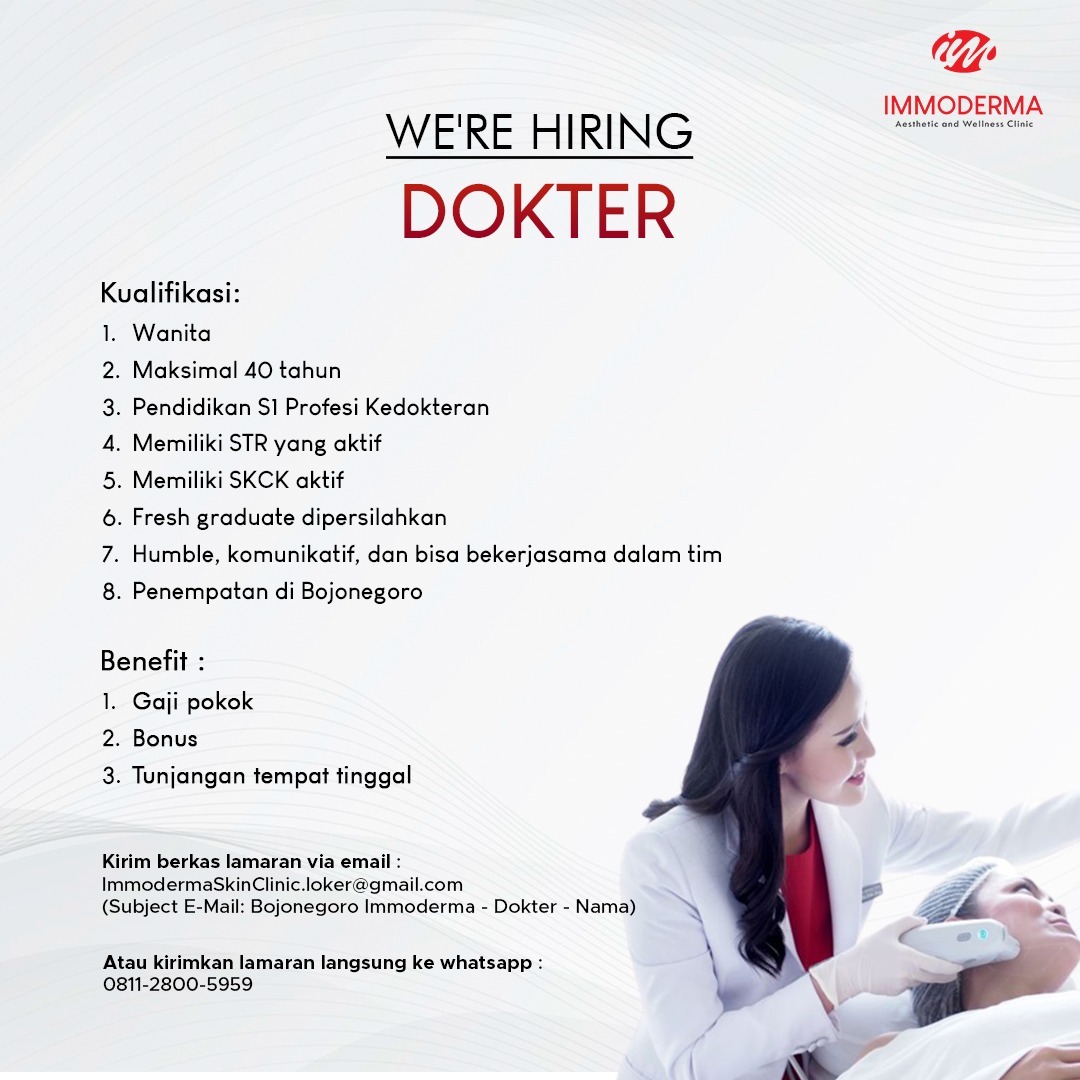 ✨ We’re Hiring — Perawat (Nurse) ✨📍 Penempatan: Immoderma Aesthetic & Wellness Clinic – Bojonegoro Immoderma Clinic sedang mencari Perawat yang berkompeten, beretika, serta memiliki passion di bidang pelayanan kesehatan dan estetika. Jika Anda ingin berkembang bersama kami dalam lingkungan Read more