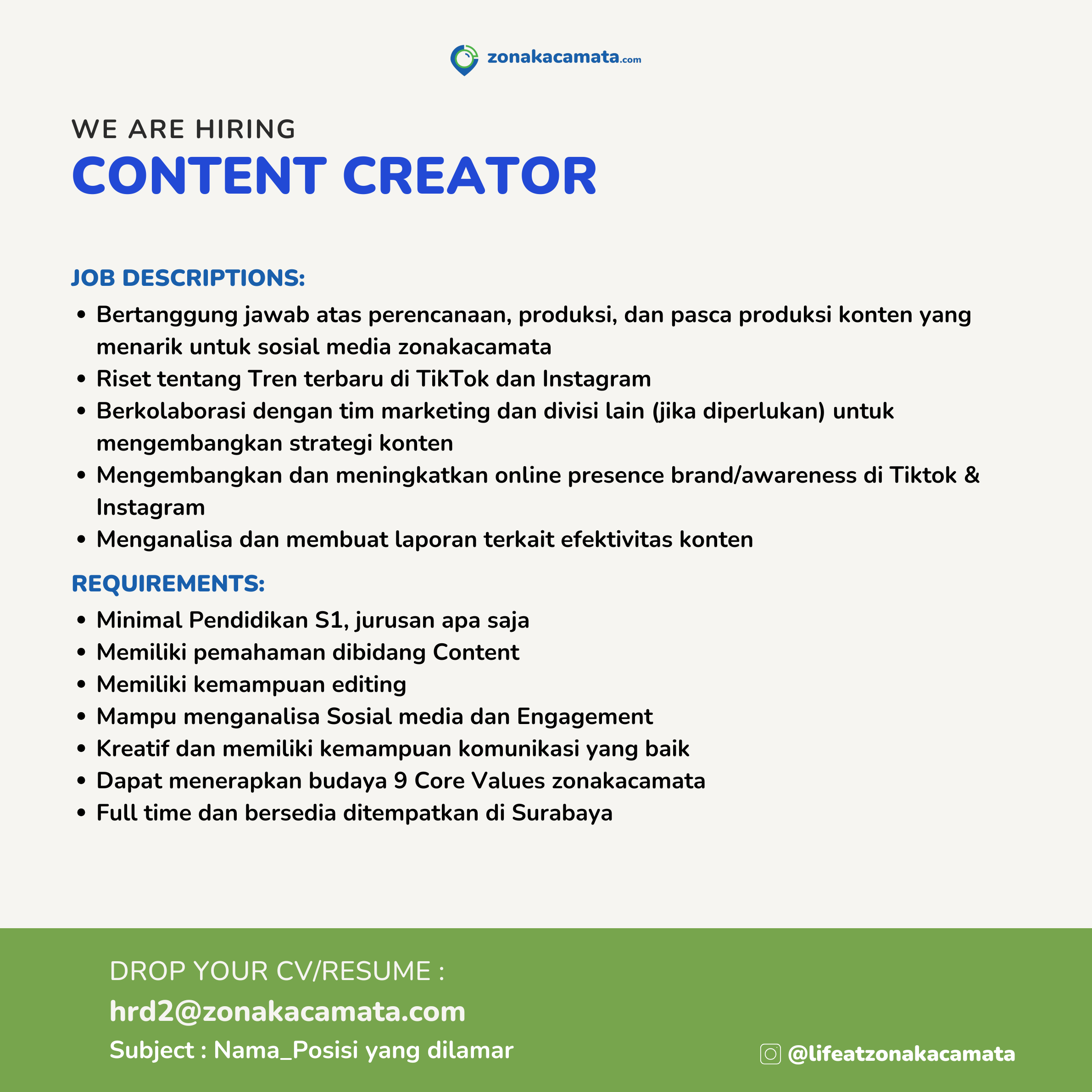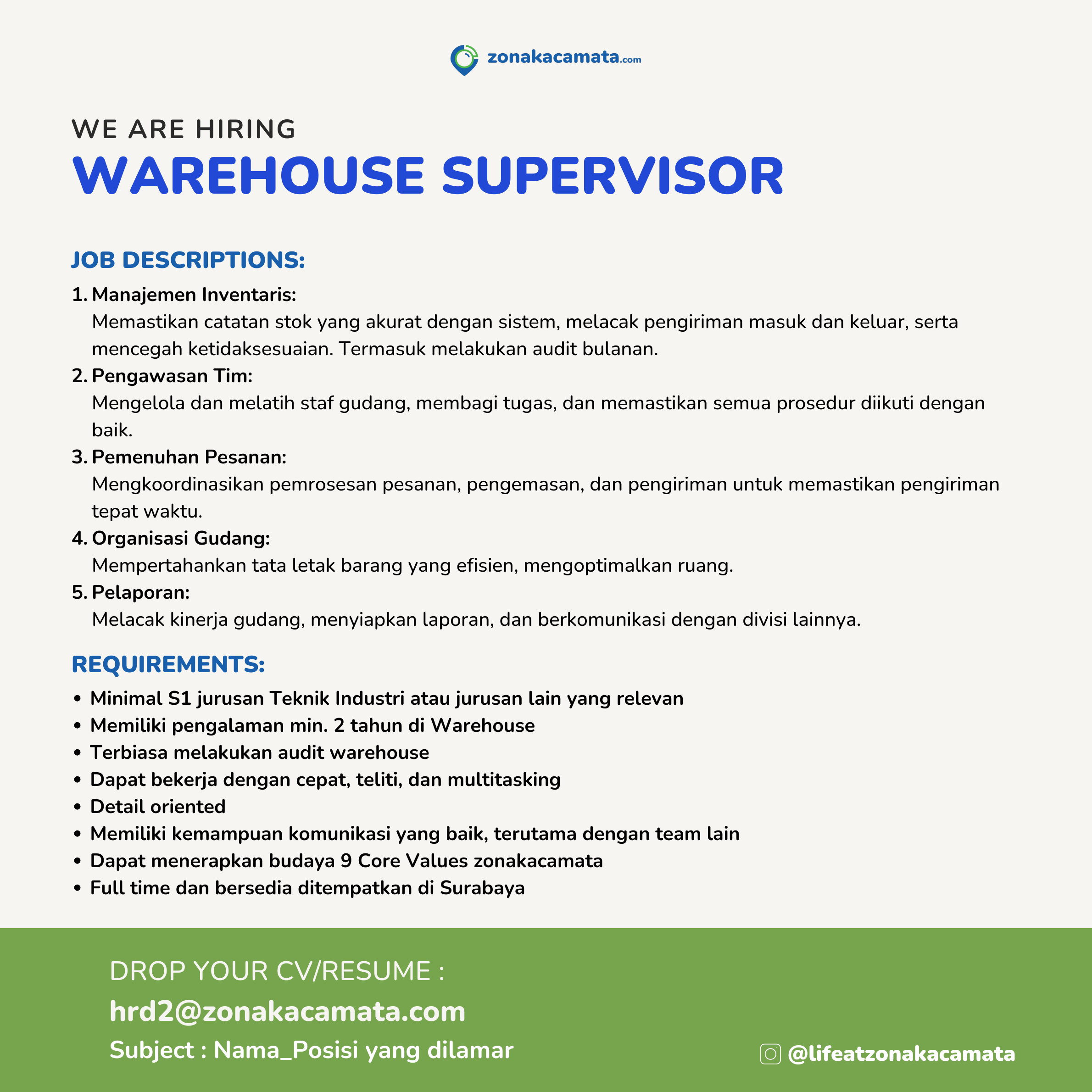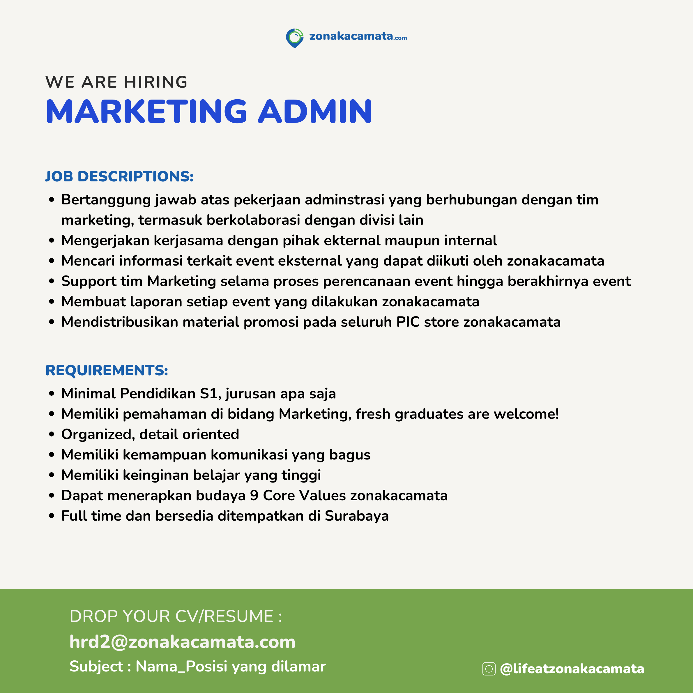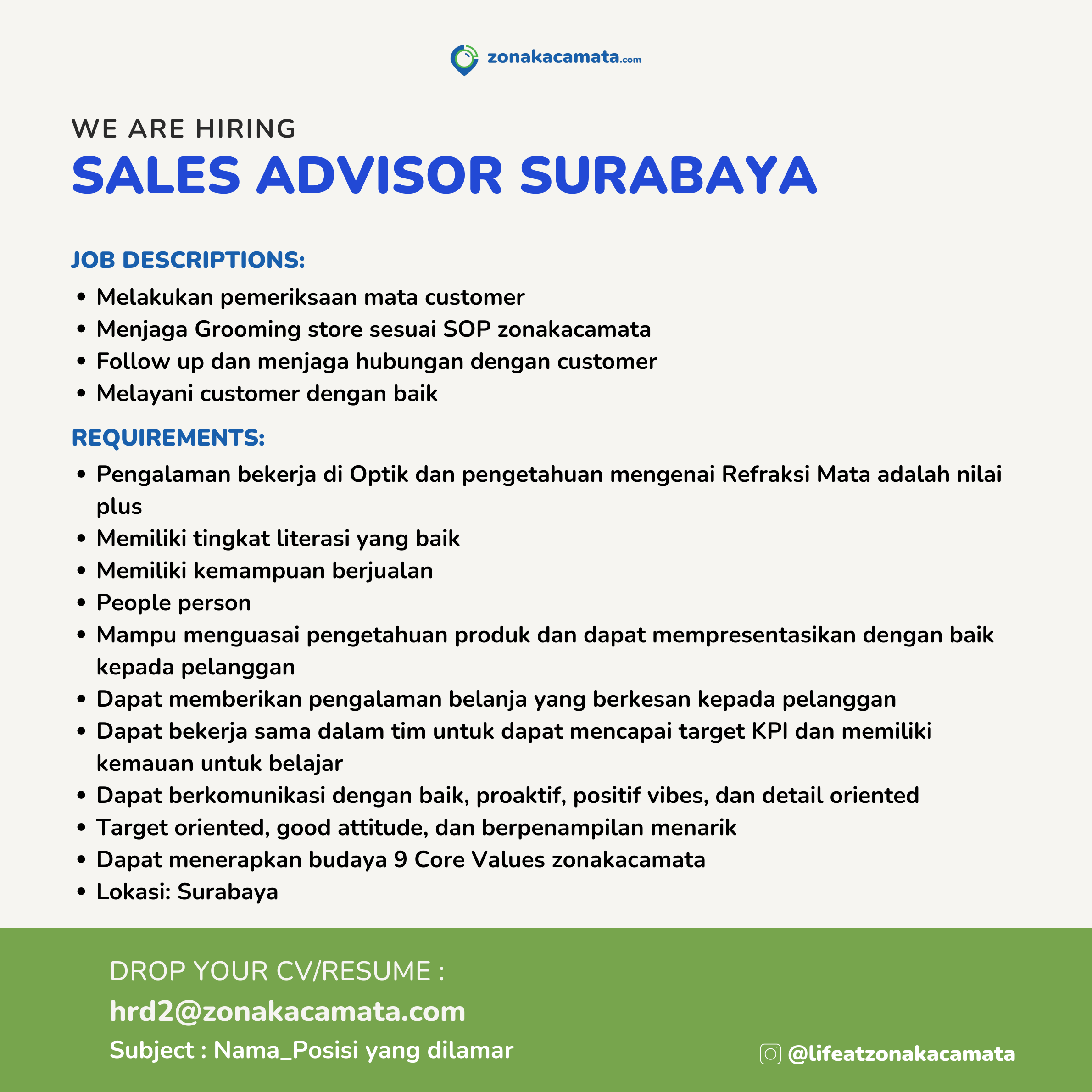 Drop your CV at : hrd2@zonakacamata.com