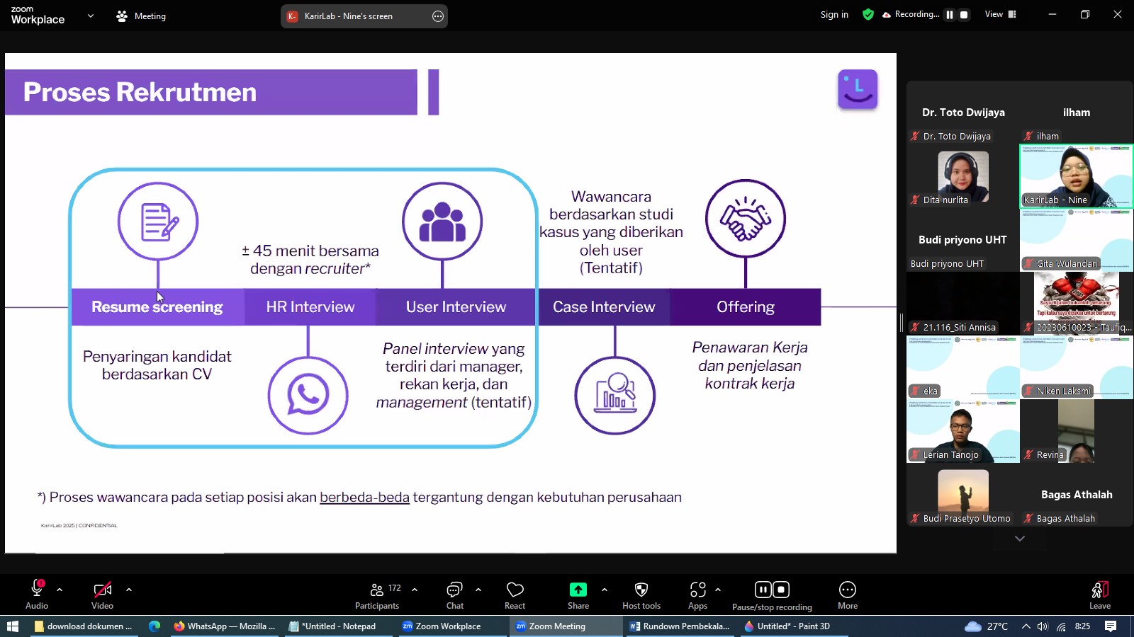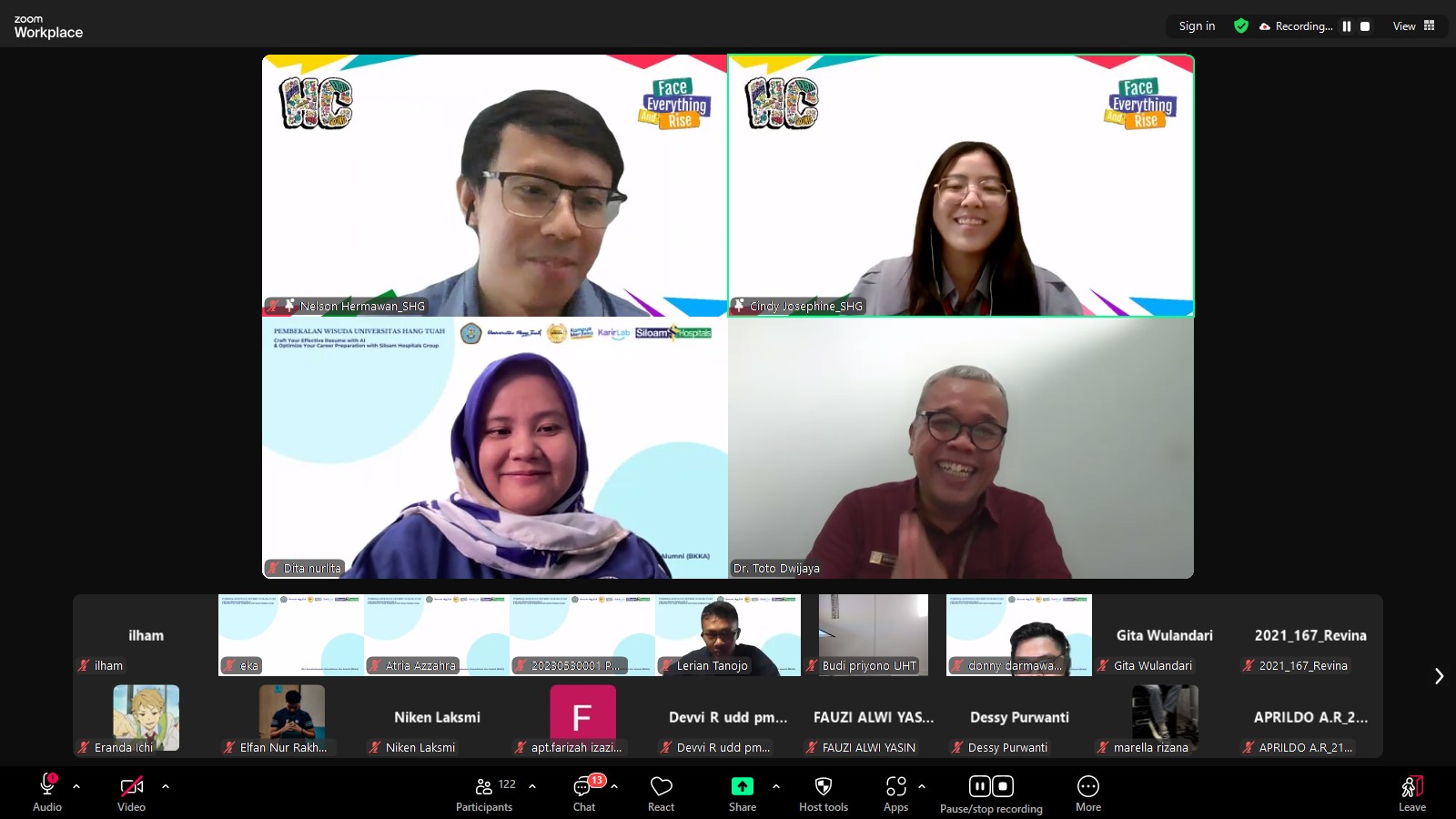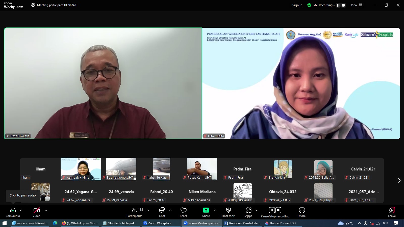 Pada 17 April 2025 Pusat Karir BKKA UHT sukses menyelenggarakan Pembekalan Karir untuk Calon Wisudawan UHT Periode I Tahun 2025 yang dilaksanakan secara online via Zoom, menghadirkan pembicara dari KarirLab : Nine Muharamah dan dari Siloam Hospitals Group : Nelson Hermawan dan Cindy Josephine. Kegiatan ini adalah bentuk pendampingan kepada Calon Wisudawan UHT agar lebih siap menghadapi dunia kerja setelah menyelesaikan study di UHT. Acara dibuka secara resmi oleh Bapak Wakil Rektor III UHT Bapak Laksma TNI (Purn) Dr. Toto Dwijaya Saputra, ST., M.Si. (Han), M.Tr.Opsla. Pada acara tersebut pihak Siloam Hospitals Group juga membuka peluang merekrut langsung Calon Wisudawan UHT baik dari lulusan Medis ataupun Non Medis/ Admin